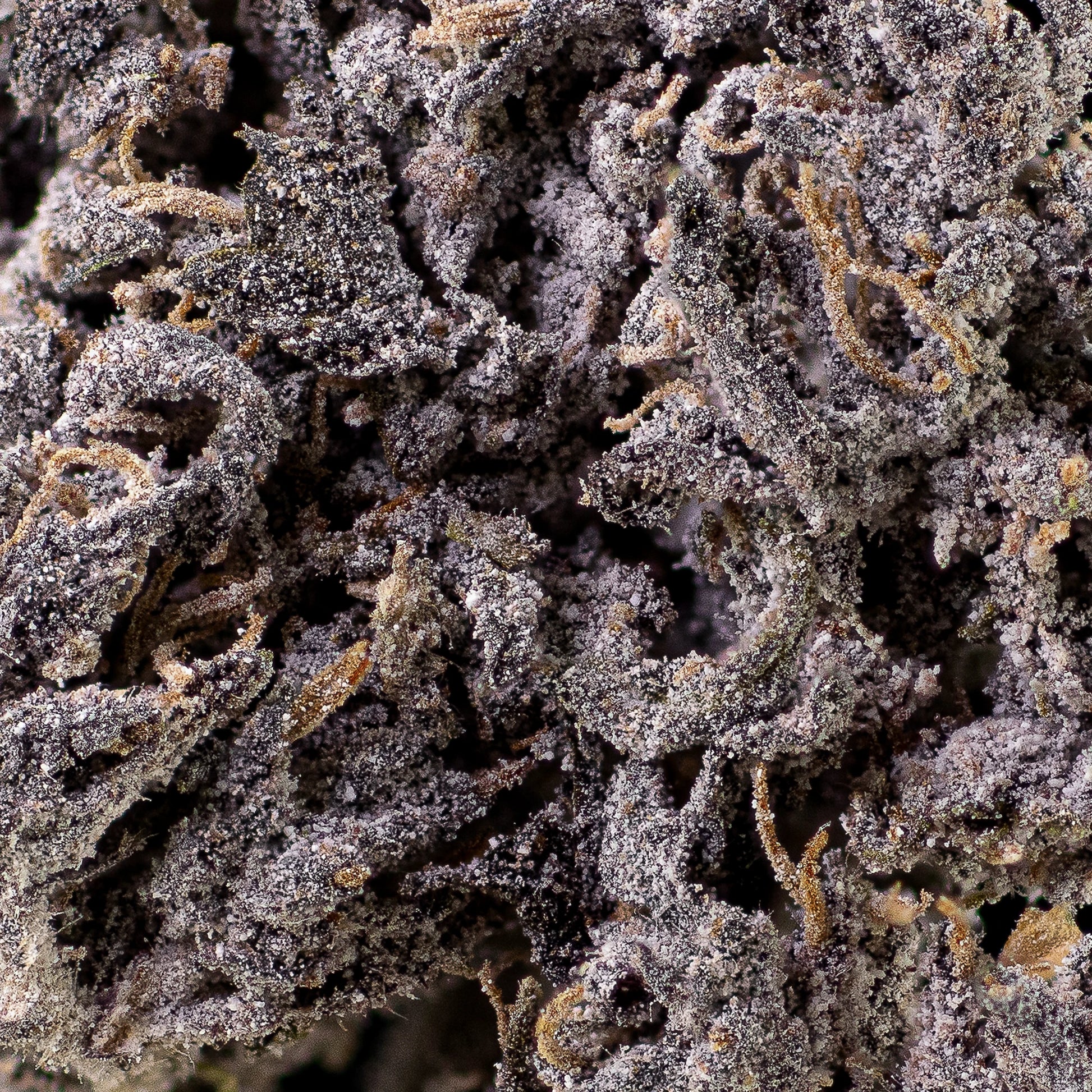 Til forskel fra mere klassiske blomster som Amnesia Indoor eller Magic Blaze, hvor grønne og orange nuancer dominerer, bærer Blood Moon et dramatisk og sjældent udtryk – pakket med tydelige trichomer, som lægger et krystallinsk lag over den mørke base.